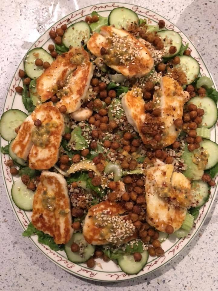 I was surprised and delighted to find passion fruit at the local Co op so paired this very unusual slightly tart flavour with the salty halloumi.